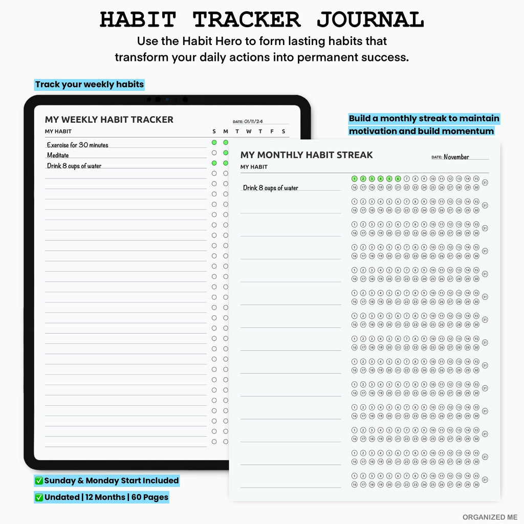 Transform your goals into lasting habits with the Habit Hero. Track your progress weekly, celebrate your wins monthly, and watch as new behaviors become automatic. Simple, effective habit tracking designed to help you create permanent positive change.