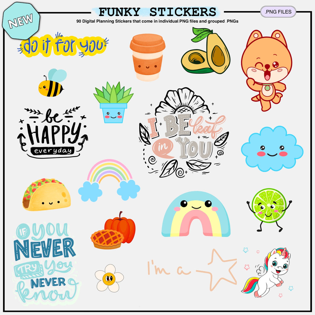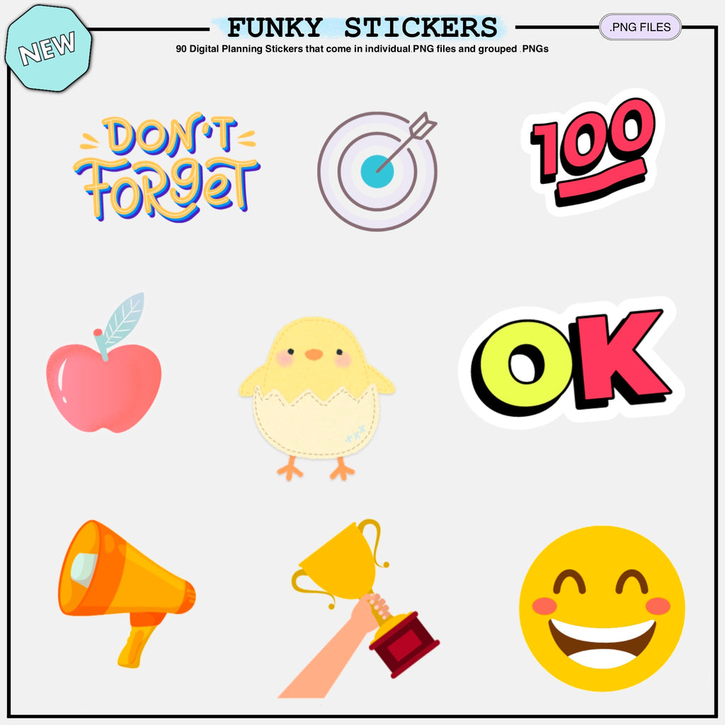 90 Digital Planning stickers that come in individual .PNG files and grouped .PNGs